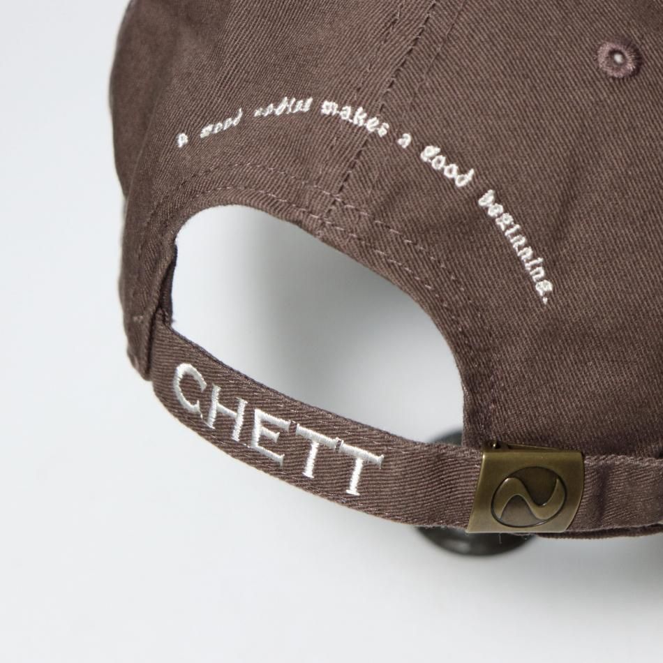 ・”なんの変哲もないからこそ飽きがこない”前面はシンプルな「〆」、背面は「A good ending makes a good beginning」とアジャスター部分にはCHETTを刺繍しています。